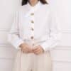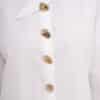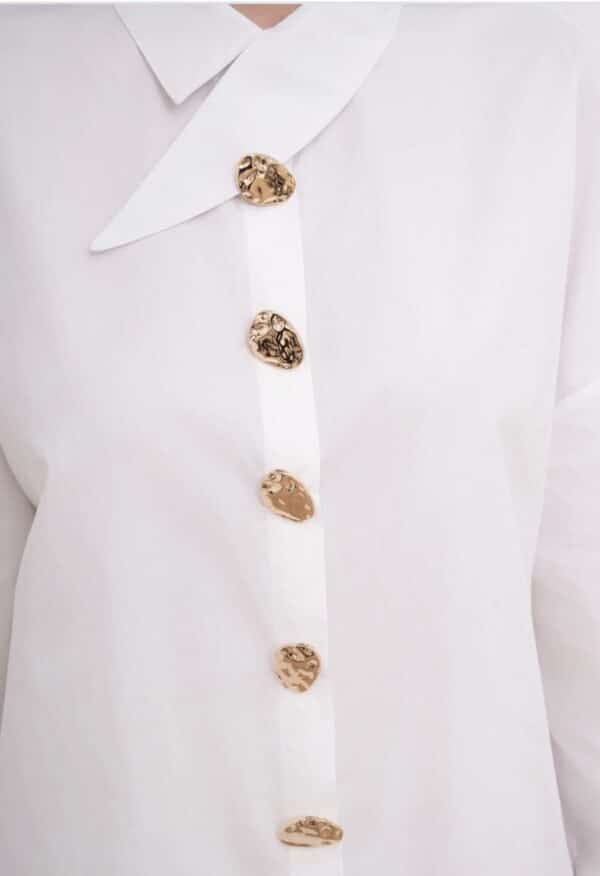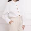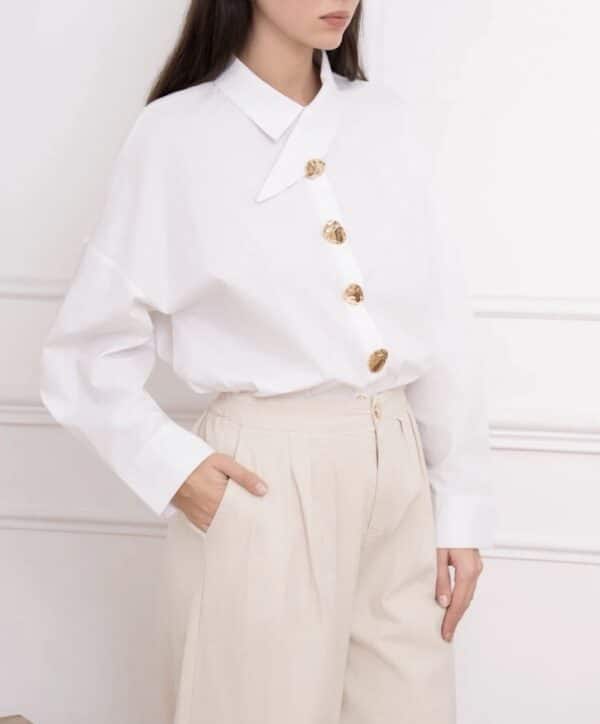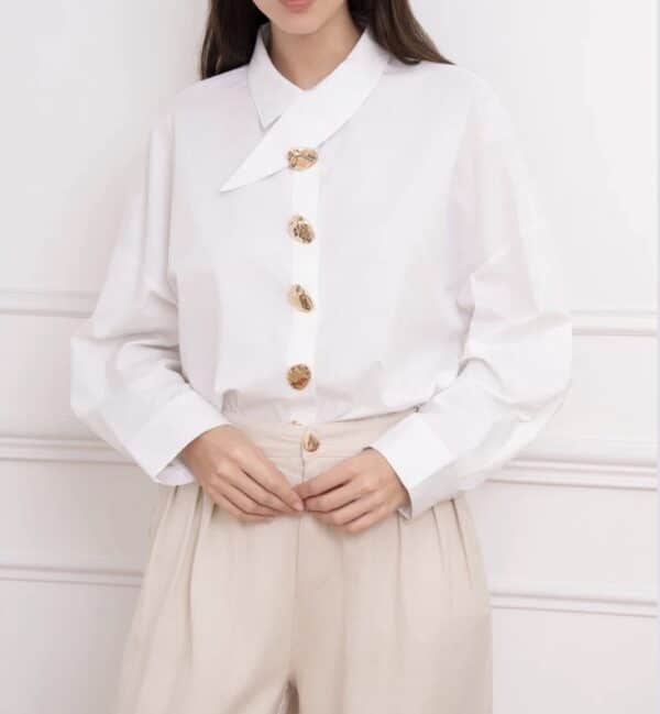 Son col asymétrique croisé attire immédiatement le regard et apporte une allure moderne et sophistiquée, tandis que sa patte de boutonnage décalée ornée de boutons dorés ajoute une note chic et lumineuse. La coupe est volontairement fluide, pour un tombé élégant et confortable au quotidien.
