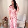 Son décolleté en V met en valeur le haut du corps, tandis que sa taille marquée avec lien souligne la silhouette. Les manches légères ajoutent une touche aérienne, et le pantalon fluide allonge la jambe pour un rendu harmonieux et raffiné.