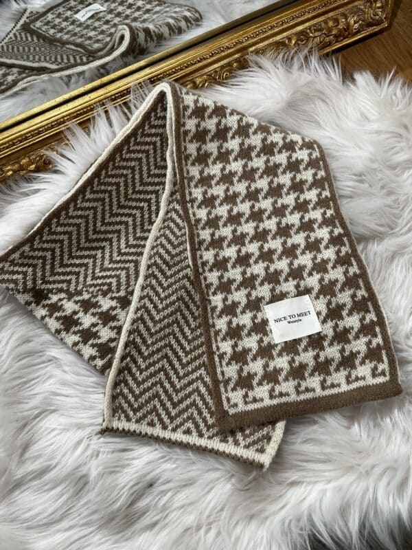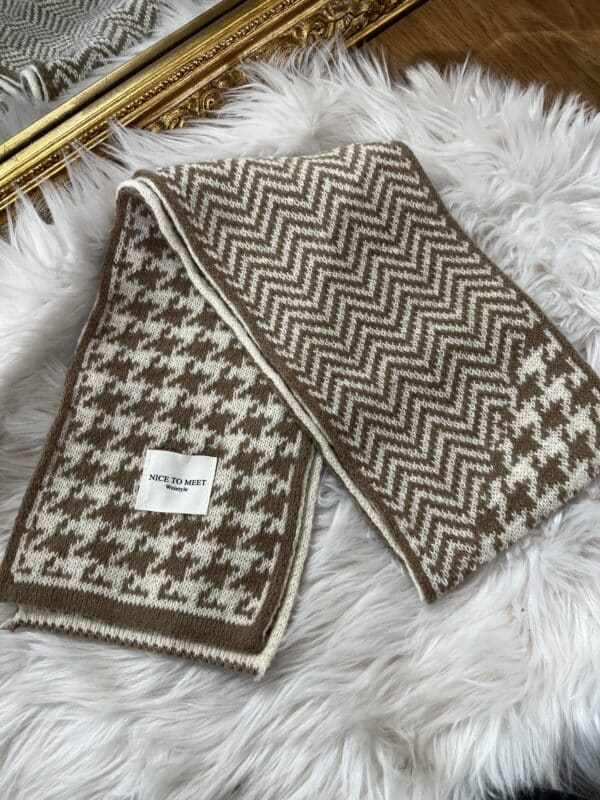 Apportez une touche d’élégance intemporelle à vos tenues avec cette superbe écharpe bicolore. Ses motifs pied-de-poule et chevrons s’accordent parfaitement pour un style chic et moderne. Douce et confortable, elle est idéale pour vous envelopper de chaleur tout en restant tendance.