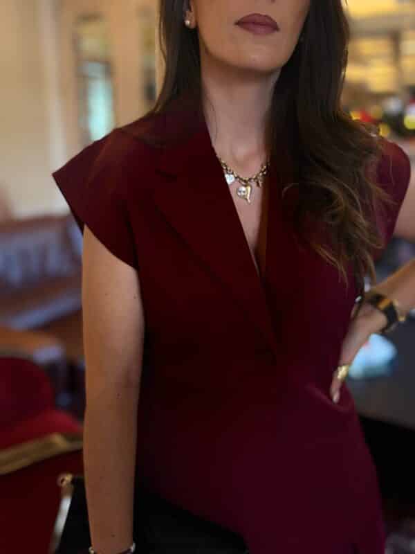 Avec ses épaules sculptées, sa coupe parfaitement structurée et son design sans manches, ce gilet blazer réinvente l’élégance moderne. Il met en valeur la silhouette en créant un effet taille marquée tout en allongeant naturellement la ligne du corps.