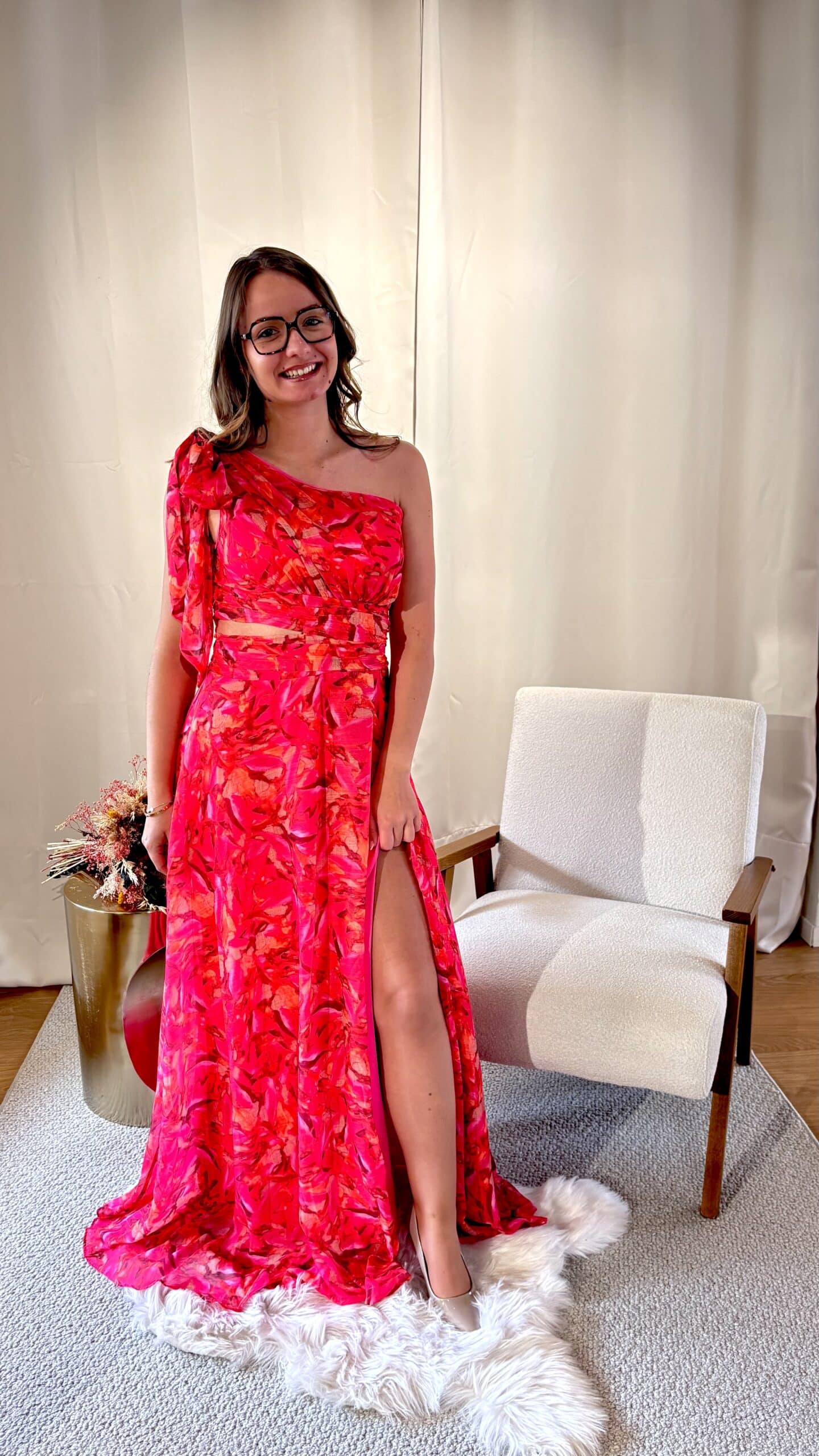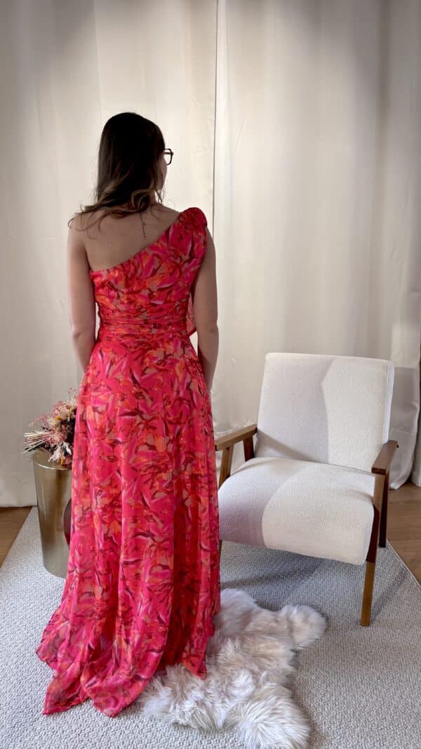 Son coloris fuchsia intense illumine le teint et attire le regard, parfait pour se démarquer avec raffinement lors d’un mariage, d’une cérémonie ou d’un événement. Sa coupe délicatement travaillée épouse le haut du corps avant de s’évaser avec légèreté, créant un mouvement fluide à chaque pas.