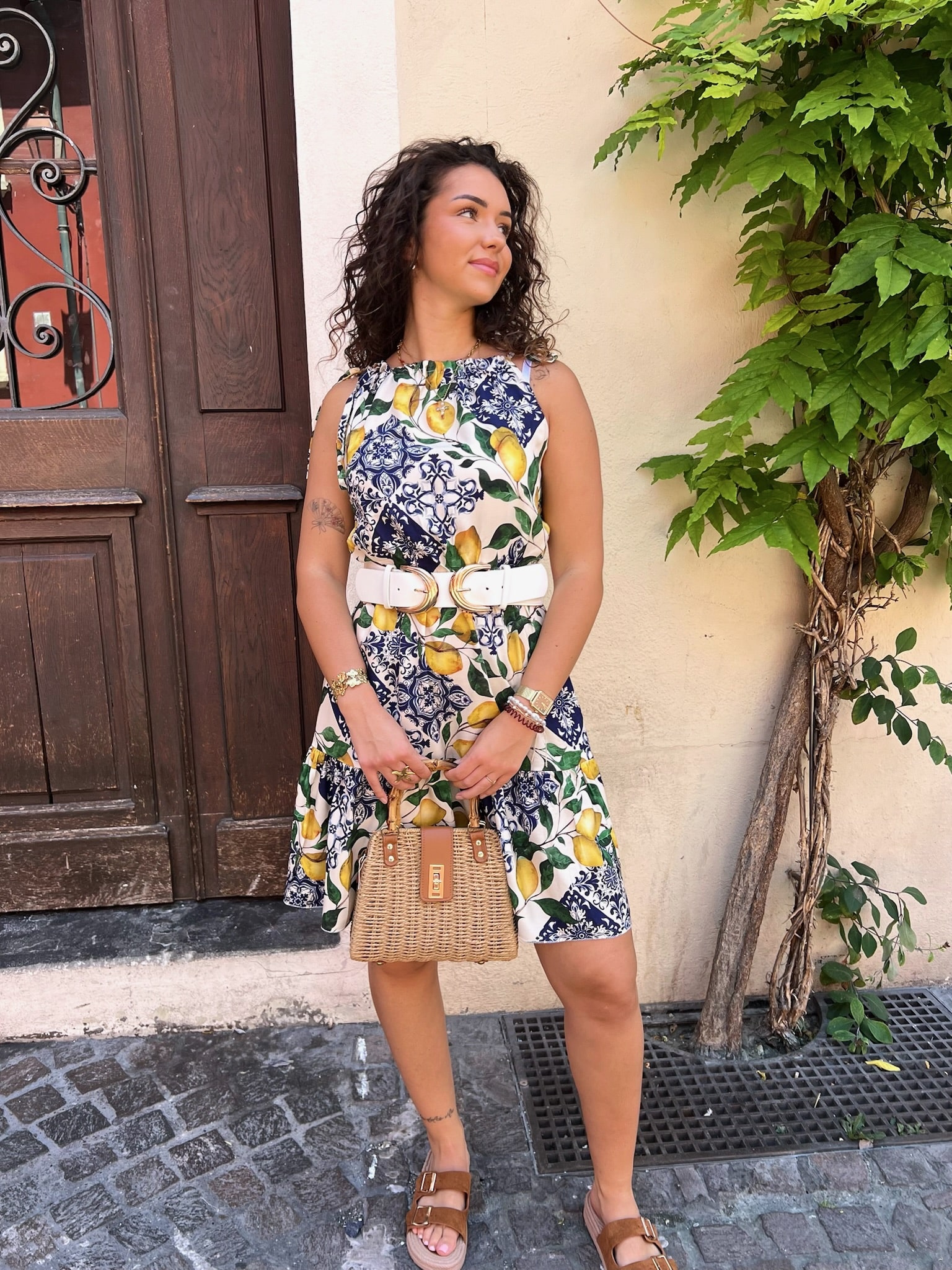 Une robe qui sent bon les vacances, voici notre robe FLAVIA, avec son joli imprimé bleu ainsi que ses citrons. Cette jolie robe saura vous mettre en valeur grâce à son élastique au niveau de la taille, en plus celui-ci vous permettra d’être à l’aise.