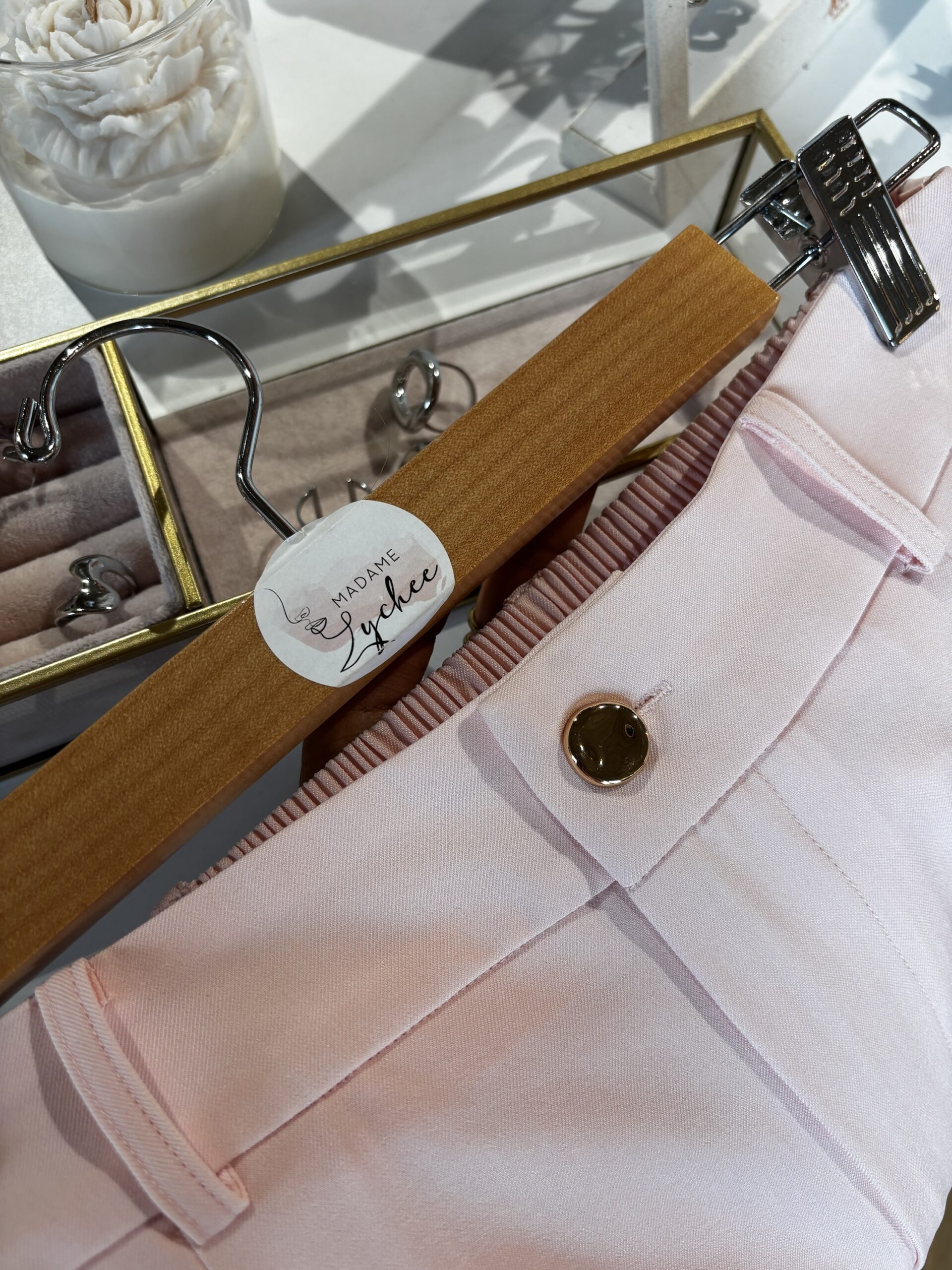 Les pinces à l’avant structurent la jambe avec élégance, tandis que la couleur rose poudré apporte une note féminine et lumineuse à vos looks.