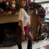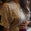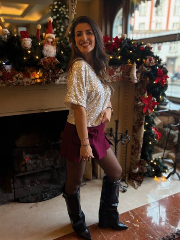 Portez-le avec un pantalon blanc, crème ou noir pour un contraste élégant. Ajoutez des boucles d’oreilles argentées ou des accessoires minimalistes pour ne pas voler la vedette aux sequins ✨