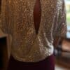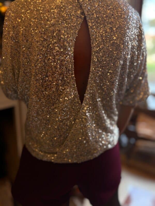 Entièrement recouvert de sequins argentés, il capte la lumière à chaque mouvement tout en gardant une coupe fluide et confortable. Le détail qui fait toute la différence : son dos ouvert en goutte, féminin, délicat et tellement chic.